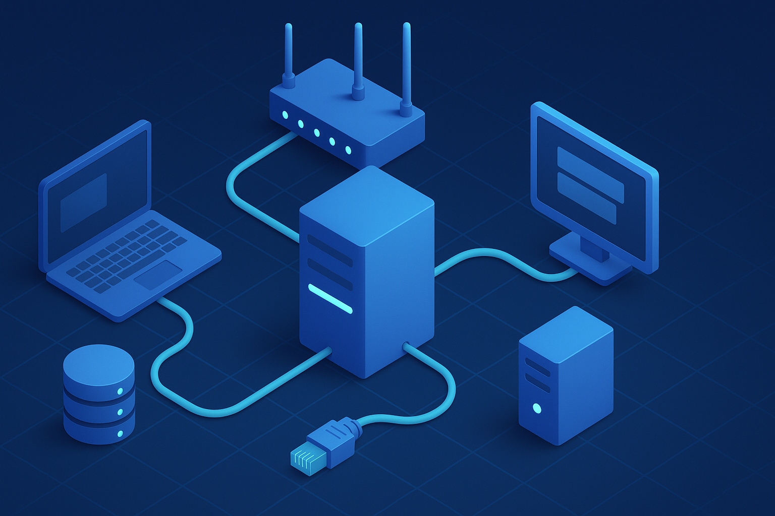 A clean and vibrant 3D-rendered digital illustration showcasing core components of a modern computer network. Read more